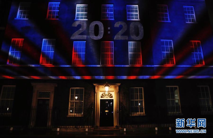 1月31日,在英国伦敦,倒计时的投影显示在唐宁街10号首相府的墙面上。 伦敦时间1月31日晚11时,英国正式“脱欧”,结束其47年的欧盟成员国身份。 新华社记者 韩岩 摄