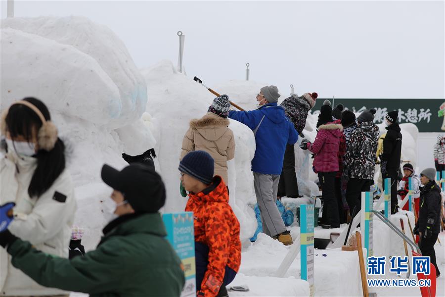 1月31日,在日本札幌,当地市民在活动现场制作雪雕。新华社记者 杜潇逸 摄