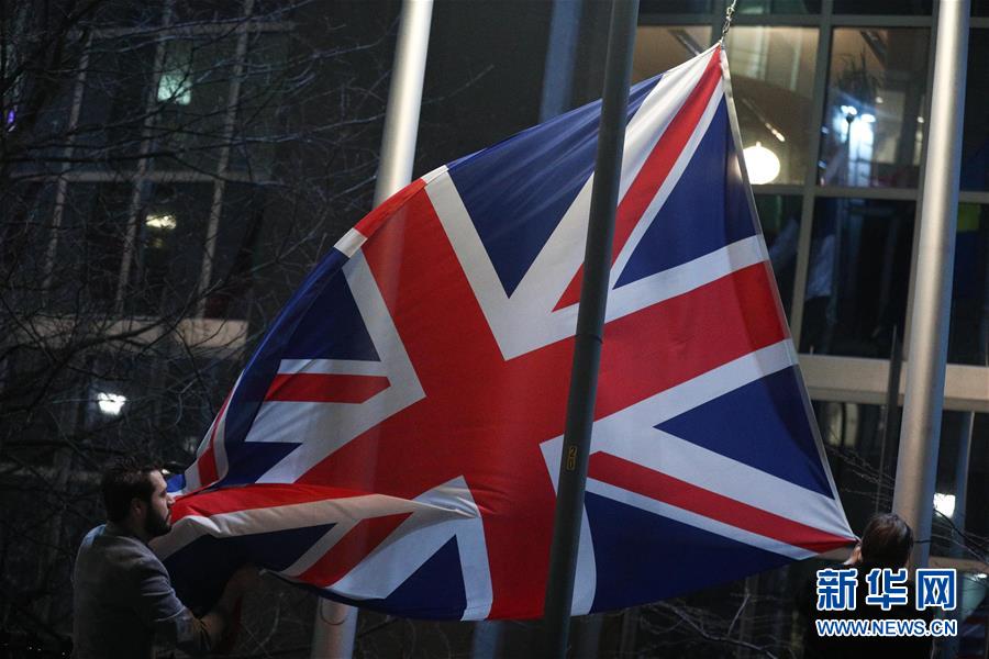 1月31日,在比利时布鲁塞尔的欧洲议会外,工作人员降下英国国旗。新华社记者 郑焕松 摄