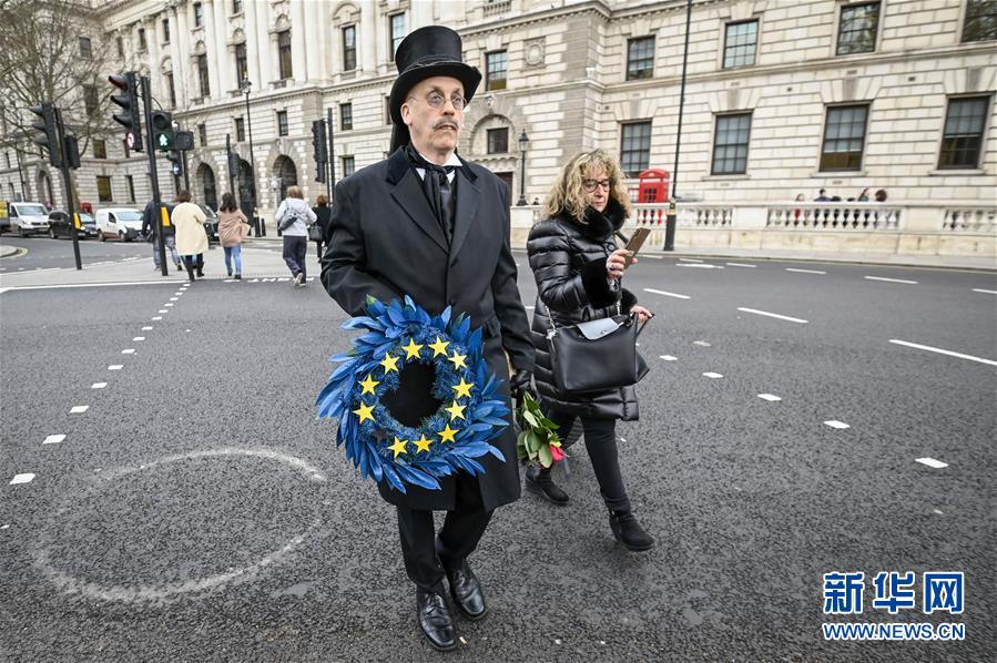 1月31日,在英国伦敦,一名男子拿着欧盟旗帜图案的花环走在街头。 新华社发(史蒂芬·程摄)