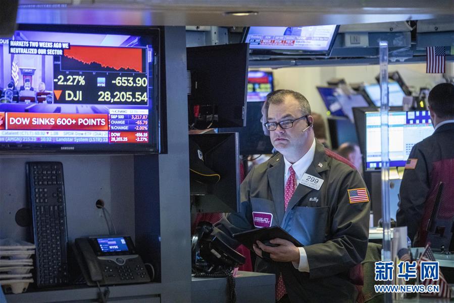 1月31日,交易员在美国纽约证券交易所工作。 纽约股市三大股指当天显著下跌。截至当天收盘,道琼斯工业平均指数比前一交易日下跌603.41点,收于28256.03点,跌幅为2.09%。标准普尔500种股票指数下跌58.14点,收于3225.52点,跌幅为1.77%。纳斯达克综合指数下跌148.00点,收于9150.94点,跌幅为1.59%。 新华社记者 王迎 摄