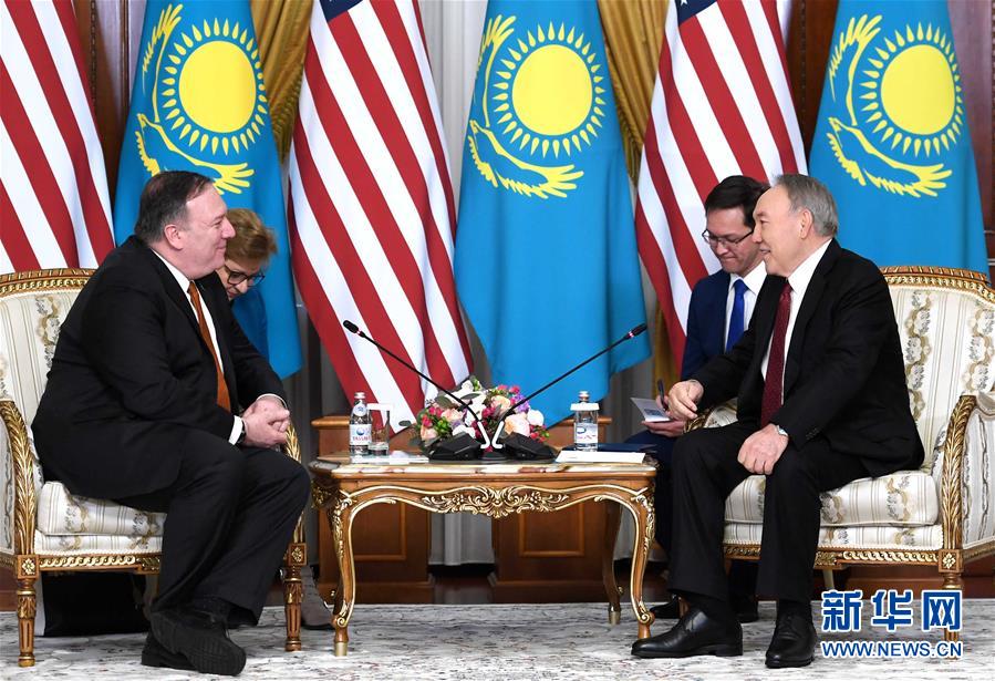 2月2日,在哈萨克斯坦努尔苏丹,哈首任总统纳扎尔巴耶夫(前右)会见美国国务卿蓬佩奥(前左)。 哈萨克斯坦总统托卡耶夫、首任总统纳扎尔巴耶夫2日分别与到访的美国国务卿蓬佩奥举行会谈,就深化两国关系,加强经贸、地区和安全合作等交换意见。 新华社发(哈萨克斯坦总统府供图)