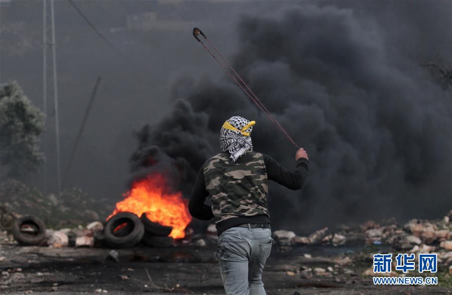 1月31日,在约旦河西岸城市纳布卢斯,一名巴勒斯坦示威者向以色列士兵投掷石块,抗议约旦河西岸的一处犹太人定居点的扩张。新华社发(尼达尔·艾仕塔耶摄)