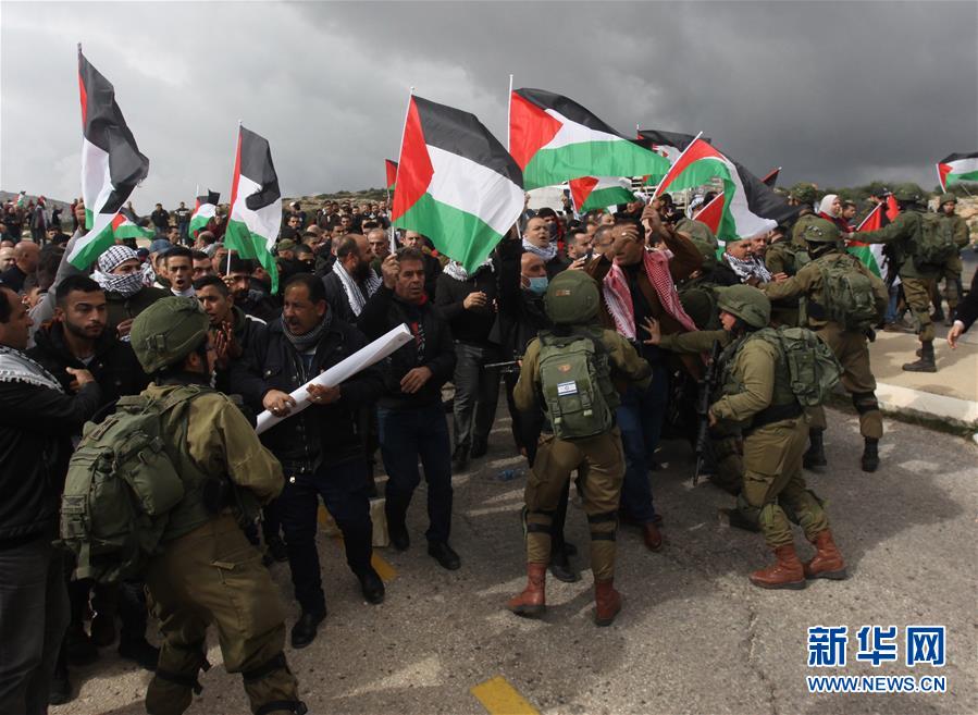 1月29日,在约旦河西岸城市图巴斯东部的泰亚西尔检查站,巴勒斯坦示威者与以色列士兵对峙,抵制“中东和平新计划”。 新华社发(尼达尔·艾仕塔耶摄)