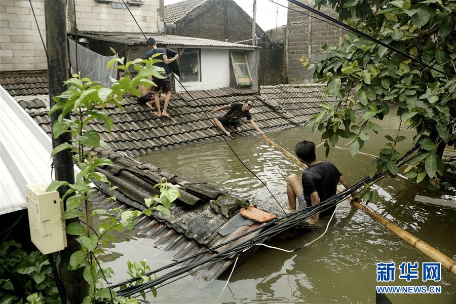 2月4日,在印度尼西亚唐格朗,一名男子借助竹竿回到自己的住所。 受洪水影响,印度尼西亚唐格朗的部分居民从家中撤离,转移至安全区域。 新华社发(桑贾亚摄)