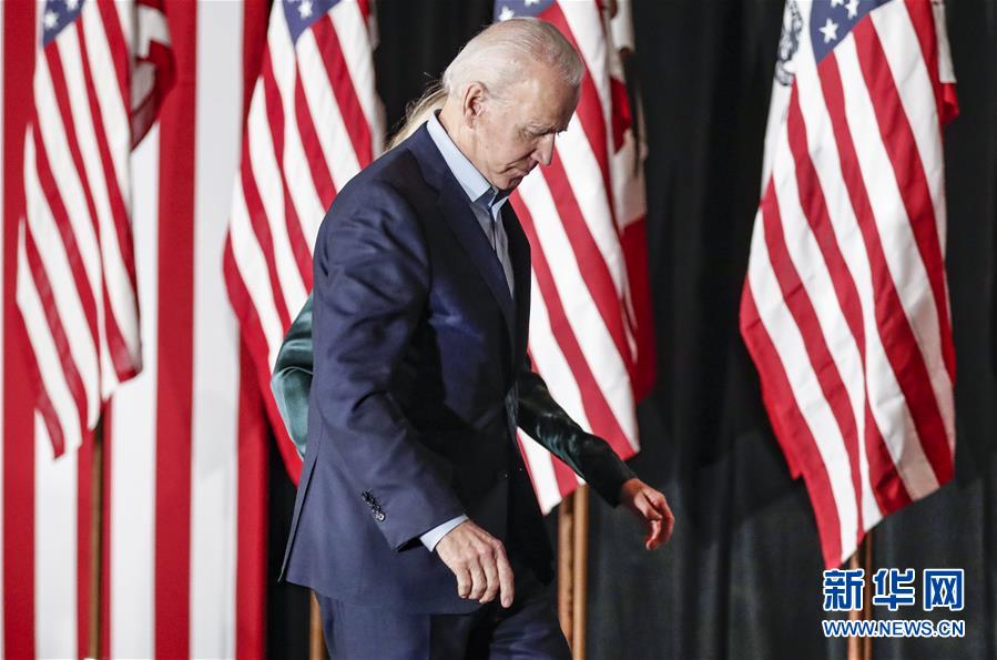 2月3日,在美国艾奥瓦州得梅因,美国民主党竞选人、前副总统拜登(前)参加民主党党内预选之夜的集会后准备离开。 根据美国艾奥瓦州民主党4日公布的部分投票结果,民主党总统竞选人布蒂吉格和桑德斯在美国总统选举民主党首场预选中领先。 新华社发(乔尔·莱纳摄)