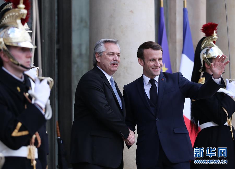 2月5日,法国总统马克龙(右二)在位于巴黎的总统府爱丽舍宫迎接来访的阿根廷总统阿尔韦托·费尔南德斯。 新华社记者 高静 摄