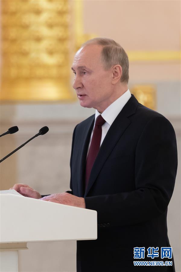 2月5日,在俄罗斯首都莫斯科,俄总统普京在国书递交仪式上致辞。 当日,普京在克里姆林宫接受23国新任驻俄大使递交国书。普京在致辞中表示,俄方愿就军控及和平解决地区危机等问题与美国进行对话。 新华社记者 白雪骐 摄