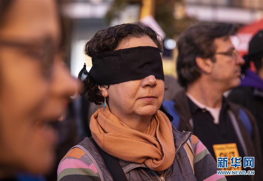 2月5日,在美国旧金山,一名参加集会的女子用黑布蒙眼,抗议美国国会参议院否决针对特朗普的弹劾条款。新华社发(李建国摄)