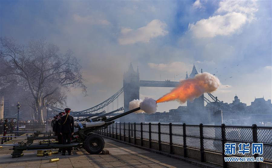 2月6日,在英国伦敦,荣誉炮兵连在伦敦塔前鸣放礼炮,庆祝英国女王伊丽莎白二世登基68周年。 新华社记者韩岩摄