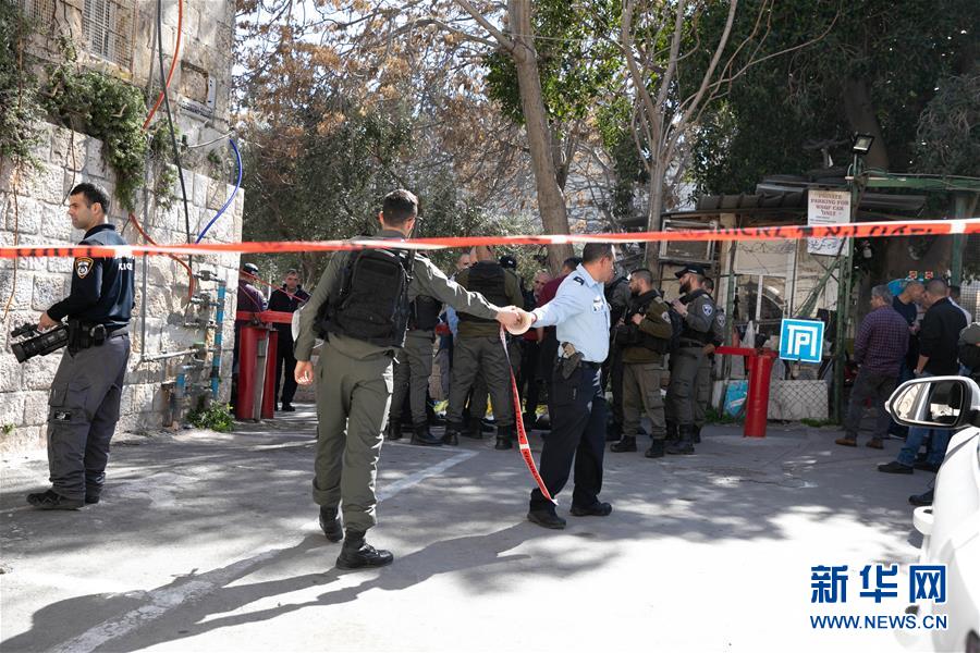 2月6日,在耶路撒冷老城,警察封锁枪击事件现场。 以色列警方说,6日中午,一名巴勒斯坦人在耶路撒冷老城的圣殿山(穆斯林称为“尊贵禁地”)入口处向执勤的以色列边防警察开枪,一名警察受轻伤。这名巴勒斯坦人被其他警察当场打死。 新华社/基尼图片社