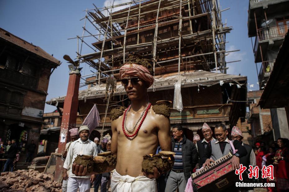 2月7日,尼泊尔帕坦,一赤裸上身的男子顶着几个油灯走街串巷。人们认为这样可以保佑自己身体健康。目前,尼泊尔正处在斯瓦斯阿尼节(Swasthani Brata Katha Festival)期间,这是节日活动的一部分。 中新社发 普拉丹 摄