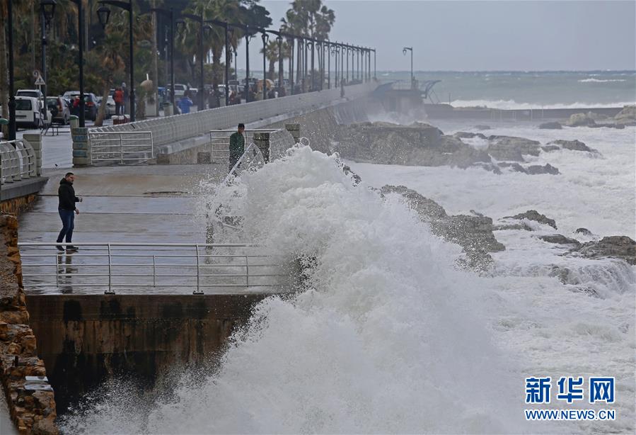 这是2月8日在黎巴嫩首都贝鲁特海滨大道拍摄的海边巨浪。 黎巴嫩8日遭遇新一轮暴风雨雪天气袭击,贝鲁特等沿海城市迎来强降雨,山区普降大雪。 新华社发(比拉尔·贾维希 摄)