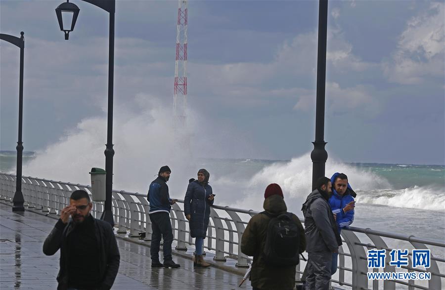 2月8日,在黎巴嫩首都贝鲁特海滨大道,民众在海边散步。 黎巴嫩8日遭遇新一轮暴风雨雪天气袭击,贝鲁特等沿海城市迎来强降雨,山区普降大雪。 新华社发(比拉尔·贾维希 摄)