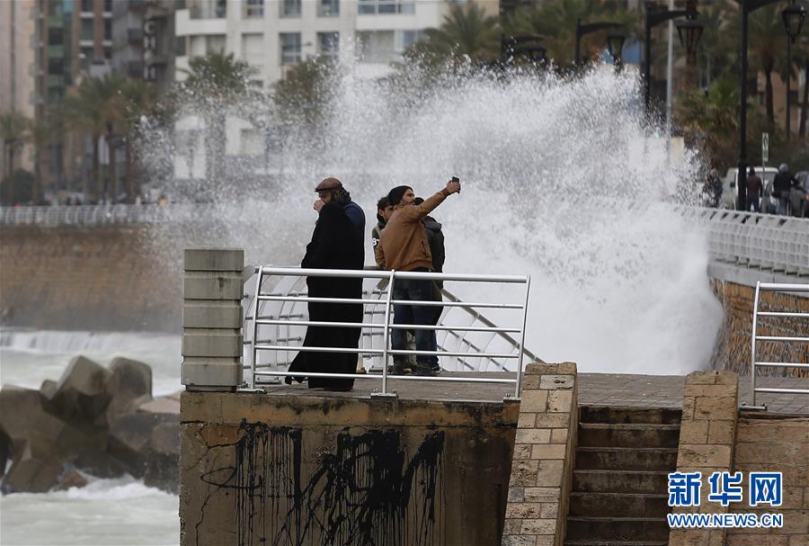 2月8日,在黎巴嫩首都贝鲁特海滨大道,民众在巨浪前自拍。 黎巴嫩8日遭遇新一轮暴风雨雪天气袭击,贝鲁特等沿海城市迎来强降雨,山区普降大雪。 新华社发(比拉尔·贾维希 摄)