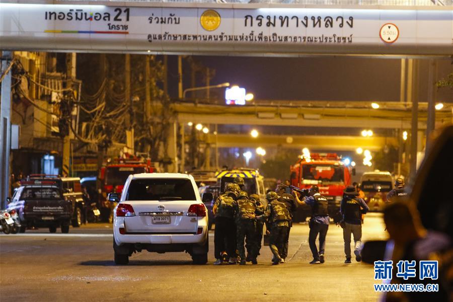 2月9日,军警在泰国呵叻府枪击事件现场警戒。 据泰国媒体9日报道,泰国东北部呵叻府枪击事件的凶手当天清晨5时30分左右被安全部队人员击毙。目前这一事件已造成21人死亡,34人受伤,无中国公民伤亡。 新华社发