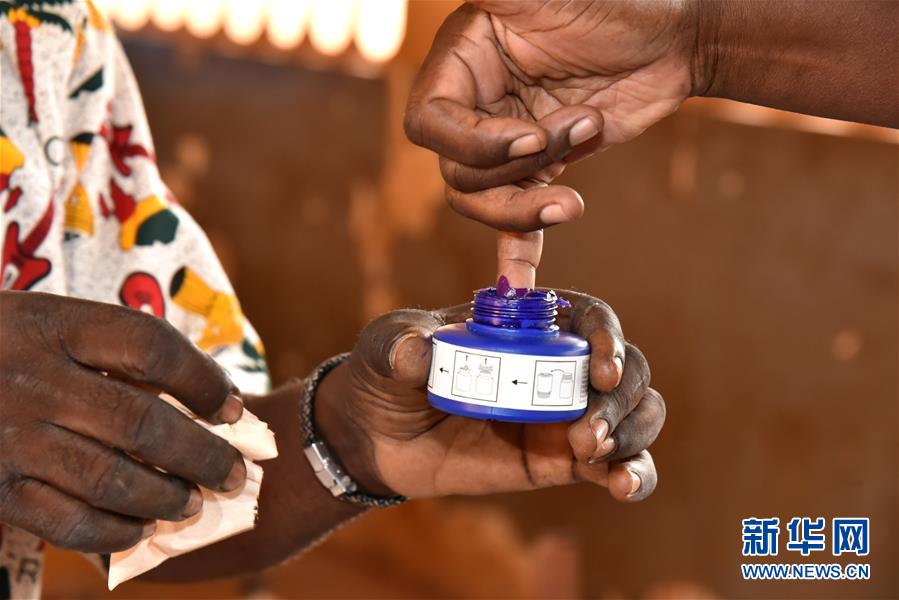 2月9日,在喀麦隆雅温得的一处投票站,一名选民在手指上蘸上墨水,以标记完成投票。新华社发(让·皮埃尔·科普索摄)