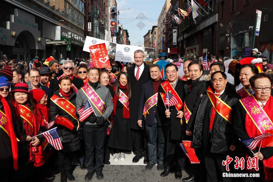 当地时间2月9日,第21届纽约新春爱心花车大游行在纽约曼哈顿唐人街举行。纽约市市长白思豪(中)、中国驻纽约总领事黄屏(前排右四)等参加游行。中新社记者 廖攀 摄