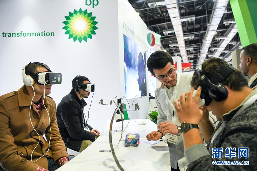 2月11日,在埃及首都开罗,人们在第四届埃及石油展览会上使用虚拟现实设备。 第四届埃及石油展览会11日在位于开罗的埃及国际会展中心开幕,来自美国、法国、阿联酋、中国等十余个国家的近500家企业参展。 新华社记者邬惠我摄