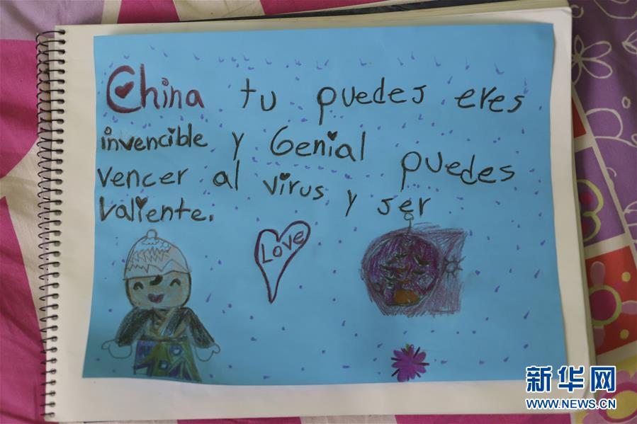 中国和拉丁美洲虽然距离遥远,但民心相通,当地民众关注着中国抗击新冠肺炎疫情的消息。在一些国家,孩子们拿起画笔,描绘出他们对中国的支持和鼓励,送上了远方的真挚祝福。 这是2月10日在墨西哥首都墨西哥城拍摄的7岁女孩尚蒂·伊茨的画作。她在画中写道:“中国,你可以的!你很棒,是不可战胜的!你一定能战胜病毒!” 新华社发(桑尼·金特罗摄)