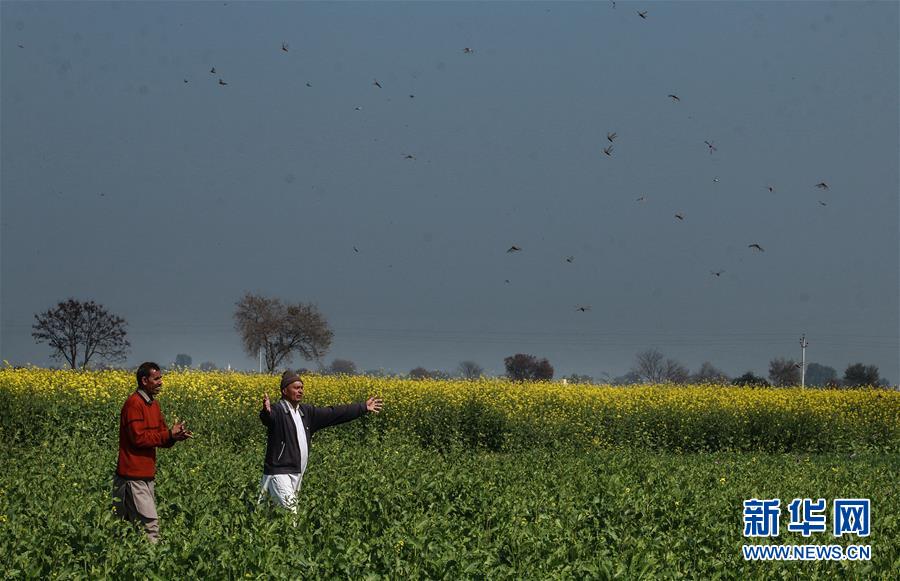 2月3日,在印度北部旁遮普邦法济尔加县,农民在田地里驱赶蝗虫。 新华社发
