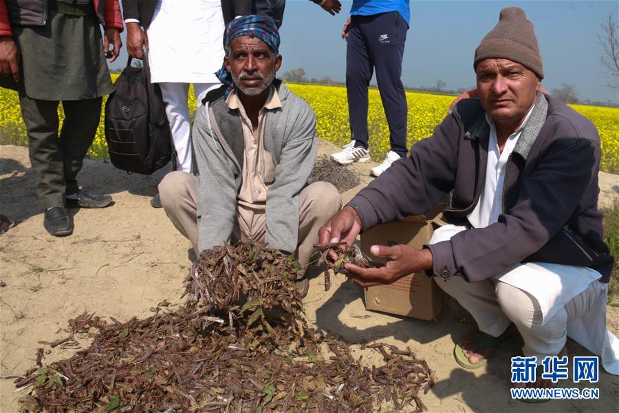 2月3日,在印度北部旁遮普邦法济尔加县,当地农民展示一片死掉的蝗虫。 新华社发