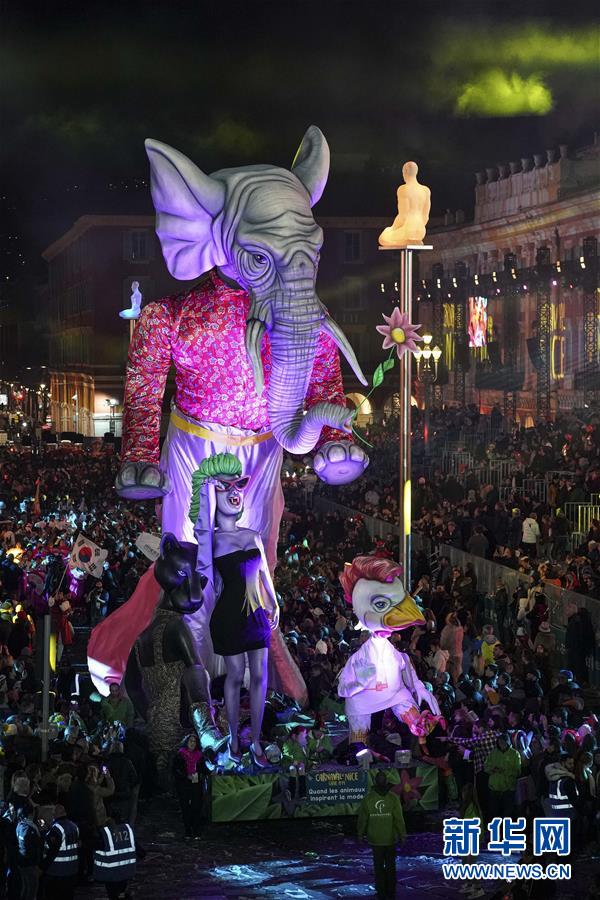 2月15日,在法国尼斯,花车参加狂欢节夜间巡游。 第136届尼斯狂欢节当日开幕,将持续至2月29日。今年狂欢节的主题是“时尚之王”。 新华社发(塞尔热·阿乌兹摄)