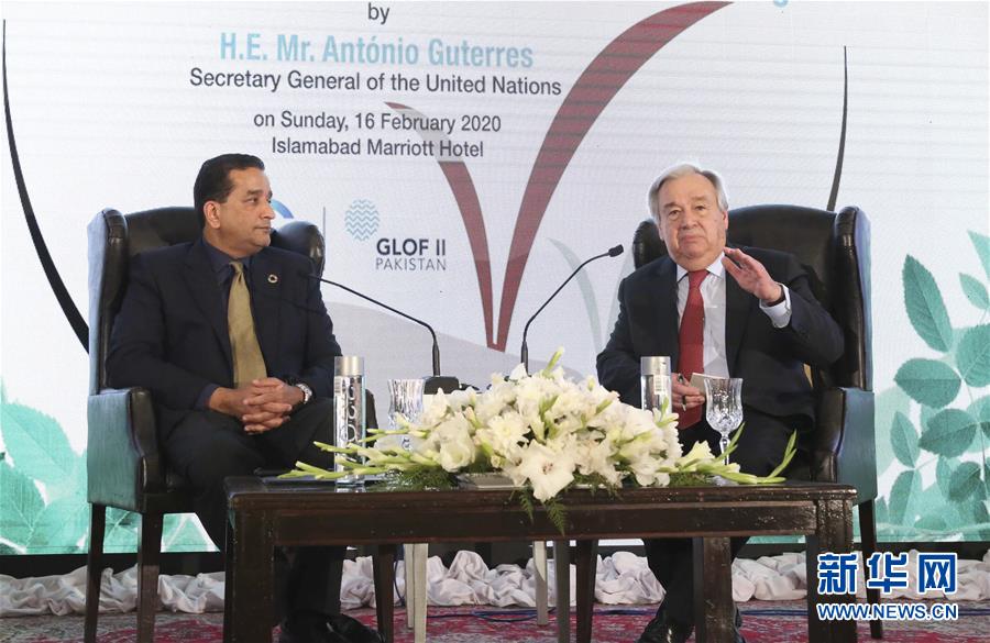 2月16日,在巴基斯坦伊斯兰堡,联合国秘书长古特雷斯(右)就气候变化问题发言。 当天,古特雷斯在伊斯兰堡发表了有关气候变化和可持续发展的演讲,呼吁世界各国努力应对气候变化这一最为重大和紧迫的问题。 新华社记者 刘天 摄