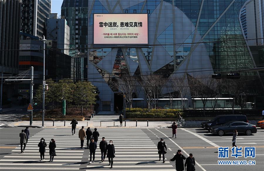 2月18日,韩国首尔市政府大楼大屏幕播出为中国加油的视频。新华社记者 王婧嫱摄