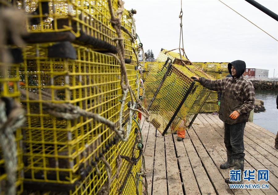 2月4日,在美国缅因州海港小镇斯托宁顿的一个码头,龙虾合作社的员工将捕捞龙虾用的笼子从船上吊装到码头。新华社记者 王迎 摄