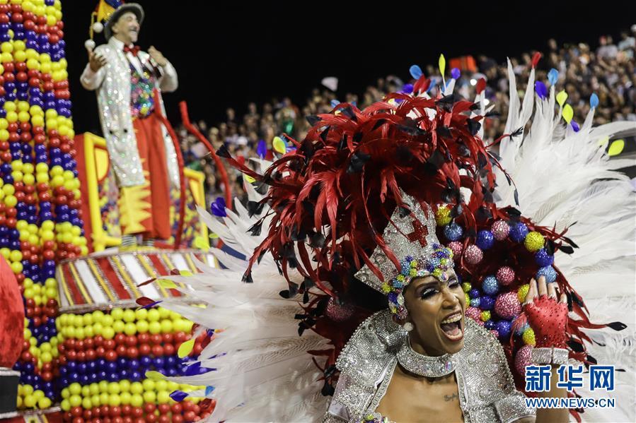 2月22日凌晨,巴西圣保罗桑巴舞校的演员参加狂欢节巡游。 2月21日深夜至22日清晨,2020年巴西圣保罗狂欢节桑巴舞校巡游开幕,7支特级组桑巴舞校的队伍在桑巴大道献上精彩表演。在接下来的三天中,还会有7支特级组队伍、8支甲级组队伍和12支乙级组队伍进行表演。 新华社发(拉赫尔·帕特拉索 摄)