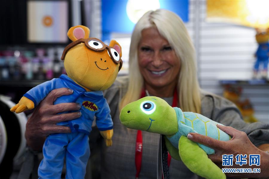2月22日,一名展商在美国纽约举行的2020纽约国际玩具展上展示儿童玩具。新华社记者 王迎 摄