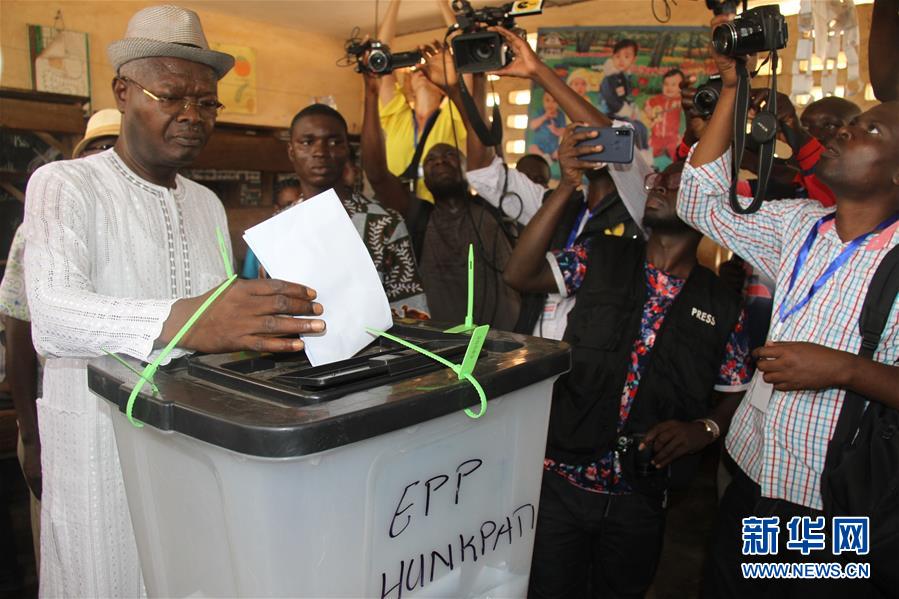 2月22日,在多哥首都洛美,多哥前总理、促进民主与发展爱国运动党主席科乔(左)在一处投票站投票。 新华社记者 肖玖阳 摄