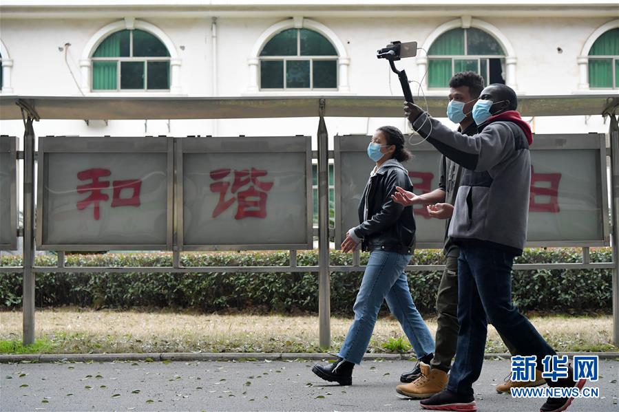 在江西财经大学校园内,龙塔约(右)和同学在校园内散步,拍摄自己的生活视频(2月21日摄)。 新华社记者 彭昭之 摄