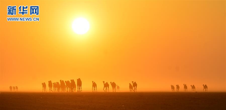 2月22日,在科威特杰赫拉省的沙漠,骆驼在晨曦中行走。 新华社发(阿萨德摄)