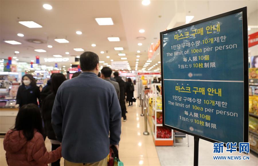 2月25日,在韩国首尔,当地居民在某大型超市排队购买口罩。 韩国疾病管理本部发布的最新统计数据显示,当地时间25日9时至16时,韩国新增84例新冠病毒感染病例,新增2例死亡病例,累计确诊病例数增至977例。 新华社/纽西斯通讯社