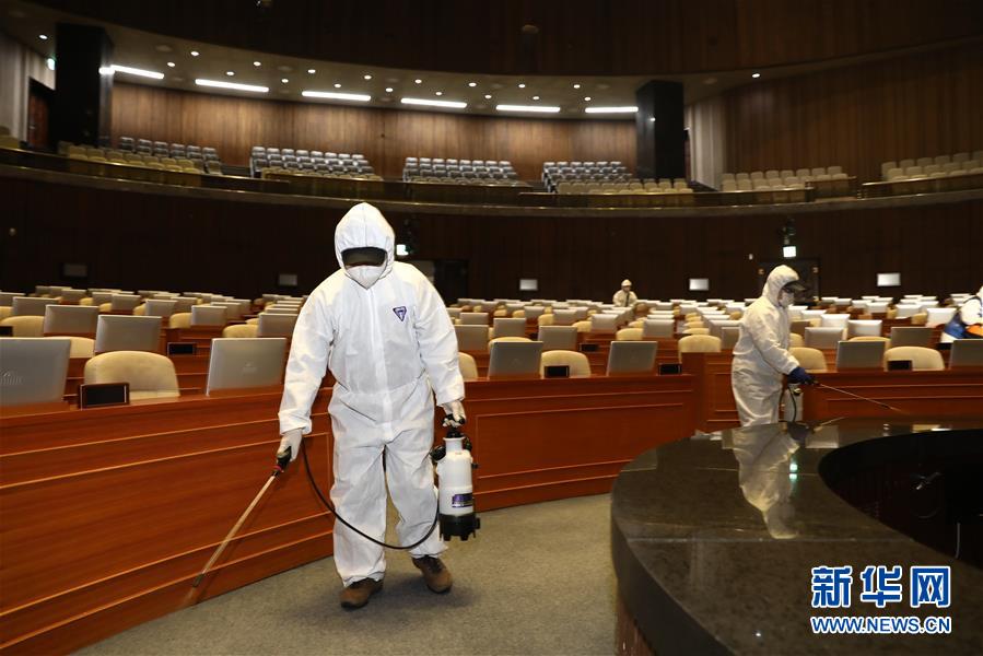 2月25日,在韩国首尔,工作人员在韩国国会主楼内进行消毒。 韩国疾病管理本部发布的最新统计数据显示,当地时间25日9时至16时,韩国新增84例新冠病毒感染病例,新增2例死亡病例,累计确诊病例数增至977例。 新华社/纽西斯通讯社