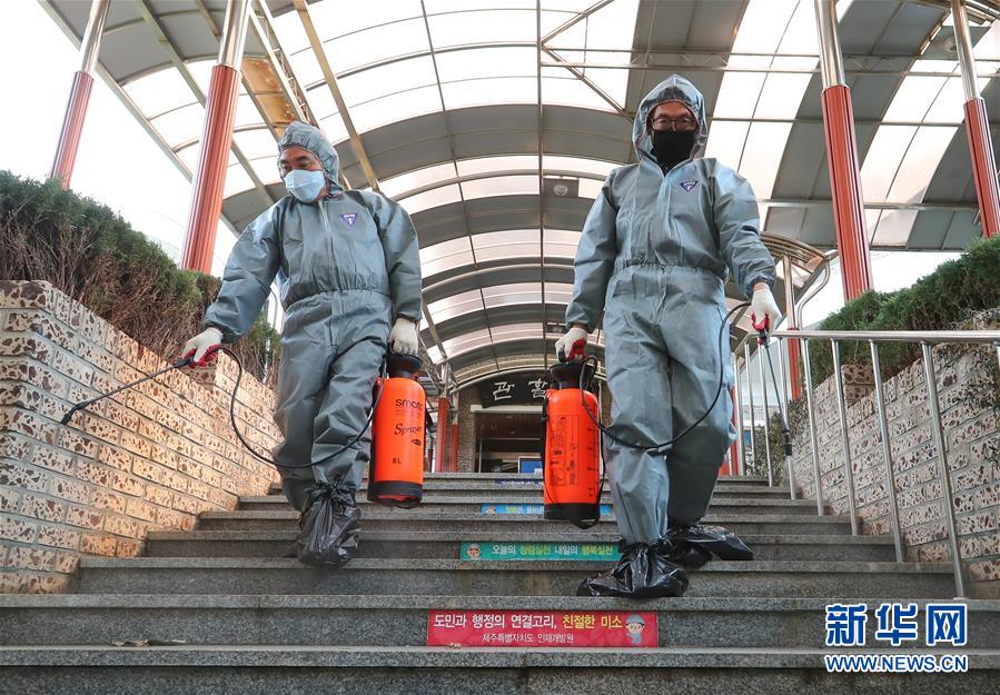 2月25日,在韩国济州,工作人员在一所研究院消毒。 韩国疾病管理本部发布的最新统计数据显示,当地时间25日9时至16时,韩国新增84例新冠病毒感染病例,新增2例死亡病例,累计确诊病例数增至977例。 新华社/纽西斯通讯社