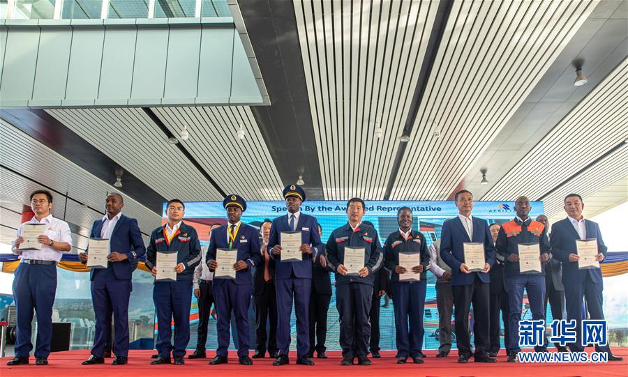 2月25日,在肯尼亚首都内罗毕举行的蒙内铁路安全运营1000天表彰会上,获得“安全卫士”称号的蒙内铁路员工在台上合影。 在蒙巴萨-内罗毕标轨铁路(蒙内铁路)安全运营1000天之际,负责铁路运营的非洲之星铁路运营公司总经理李久平25日说,蒙内铁路取得了良好的社会效益和经济效益,助力肯尼亚经济和社会发展。 新华社记者 张宇 摄