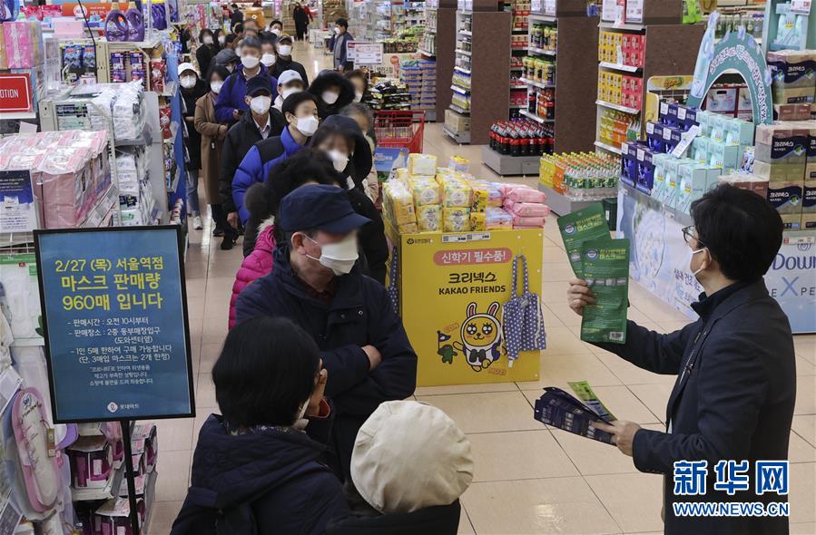 2月27日,在韩国首尔,人们在一家超市排队购买口罩。 韩国疾病管理本部27日发布的最新统计数据显示,当地时间26日16时至27日9时,韩国新增334例新冠病毒感染病例。韩国国会已在26日修订相关法案,加强防控措施。目前,韩国累计确诊病例增至1595例,死亡12例,治愈24例确诊病例并解除隔离。 新华社/纽西斯通讯社