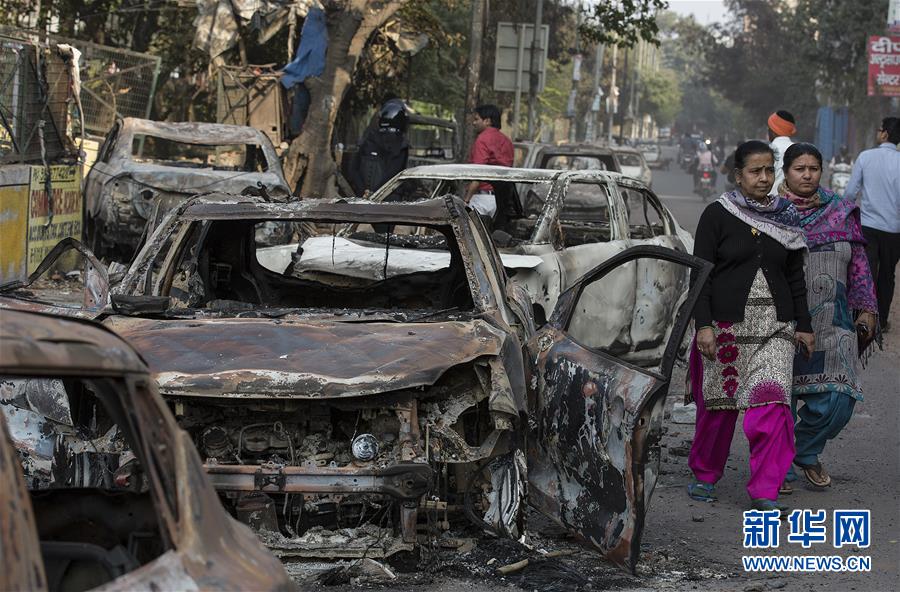 2月26日,在印度首都新德里,人们走过在冲突中被烧毁的车辆。 据《今日印度》等媒体27日报道,印度《公民身份法》修正案支持者和反对者自24日开始在首都地区发生的骚乱仍在持续,目前死亡人数已上升至35人,其中包括一名警察和一名情报人员;另有200多人受伤,其中70多人是枪伤。 新华社发(贾韦德·达尔摄)