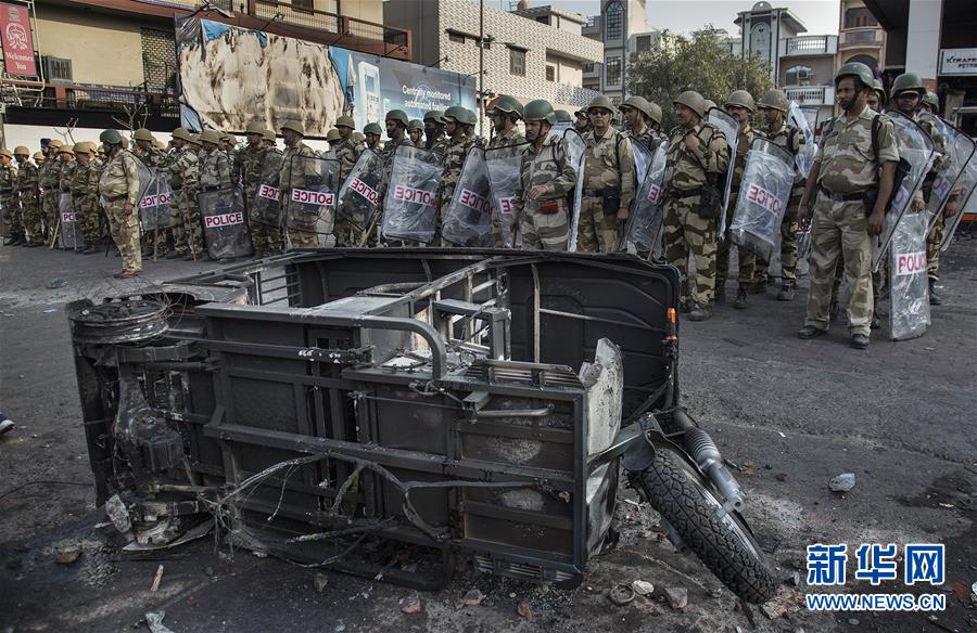 2月26日,在印度首都新德里,准军事人员聚集在被烧毁的车辆旁警戒。 据《今日印度》等媒体27日报道,印度《公民身份法》修正案支持者和反对者自24日开始在首都地区发生的骚乱仍在持续,目前死亡人数已上升至35人,其中包括一名警察和一名情报人员;另有200多人受伤,其中70多人是枪伤。 新华社发(贾韦德·达尔摄)