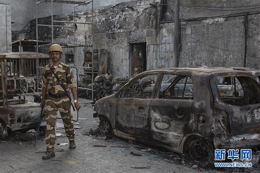 2月26日,在印度首都新德里,一名准军事人员走过在冲突中被烧毁的车辆。 据《今日印度》等媒体27日报道,印度《公民身份法》修正案支持者和反对者自24日开始在首都地区发生的骚乱仍在持续,目前死亡人数已上升至35人,其中包括一名警察和一名情报人员;另有200多人受伤,其中70多人是枪伤。 新华社发(贾韦德·达尔摄)