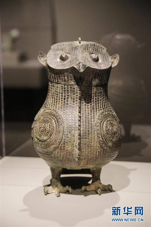 这是2月26日在美国休斯敦举办的中国古代青铜礼器展览会预展上拍摄的猫头鹰造型酒樽。 位于美国休斯敦的美国亚洲协会得克萨斯州中心26日晚举办中国古代青铜礼器展览会预展,当地各界人士出席。以“永恒的奉献:中国青铜礼器”为主题的中国青铜礼器展览会将于2月29日至8月9日举行,展出从商朝至汉朝的近100件青铜器,同时还将展出一些玉器和瓷器。 新华社发(劳承跃摄)
