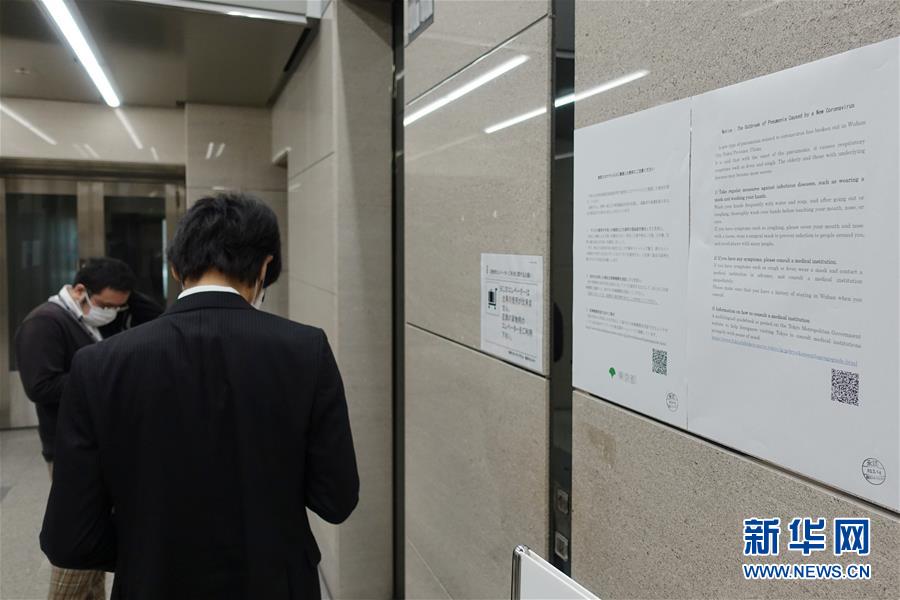 2月27日,在日本东京一座写字楼内,人们戴口罩等电梯。新华社记者 杜潇逸 摄