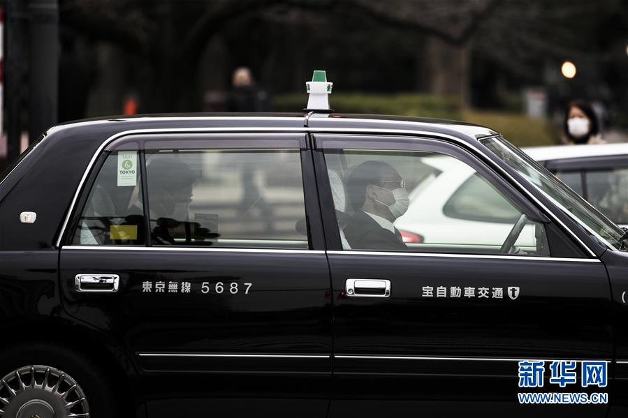 2月25日,在日本东京的一辆出租车内,乘客(左)和司机都戴着口罩。新华社记者 杜潇逸 摄