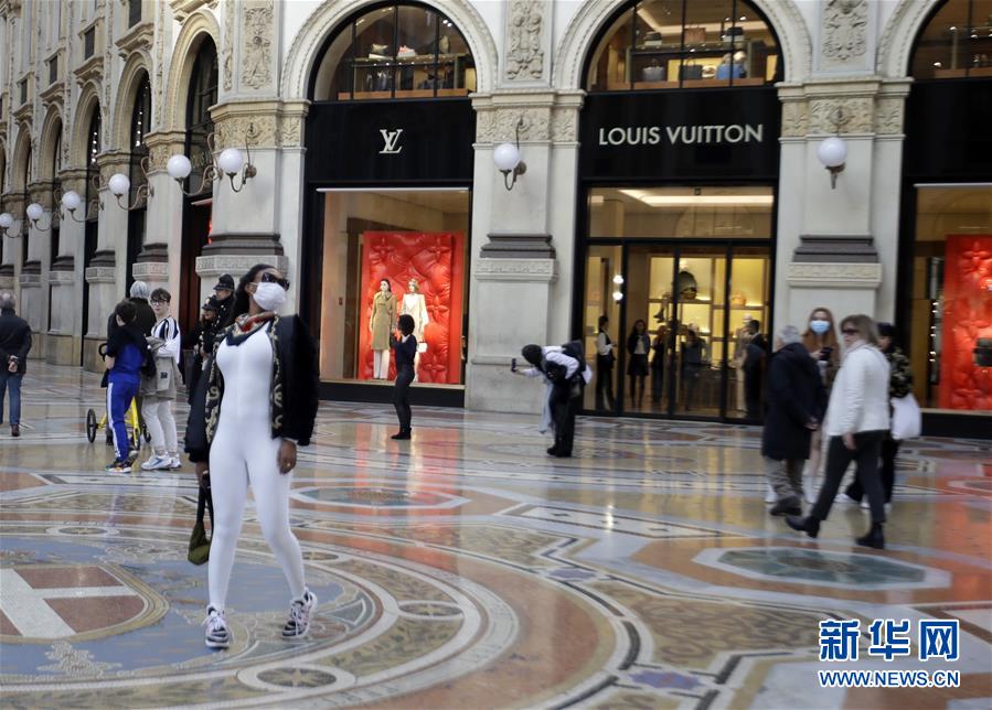 2月28日,在意大利米兰的地标建筑维托里奥·埃马努埃莱二世拱廊,人们戴口罩出行。新华社发(阿尔贝托·林格里亚摄)