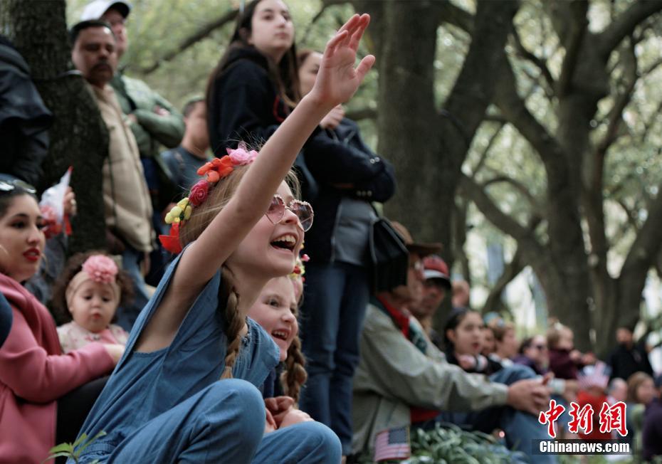 当地时间2月29日,美国休斯敦市中心举行2020年度牛仔节游行,百余辆花车和牛仔方阵在市民的欢呼声中沿街道行进,为一年一度的“休斯敦牲畜展与牛仔节”拉开帷幕。图为小朋友们与牛仔节游行人群打招呼。中新社记者 曾静宁 摄