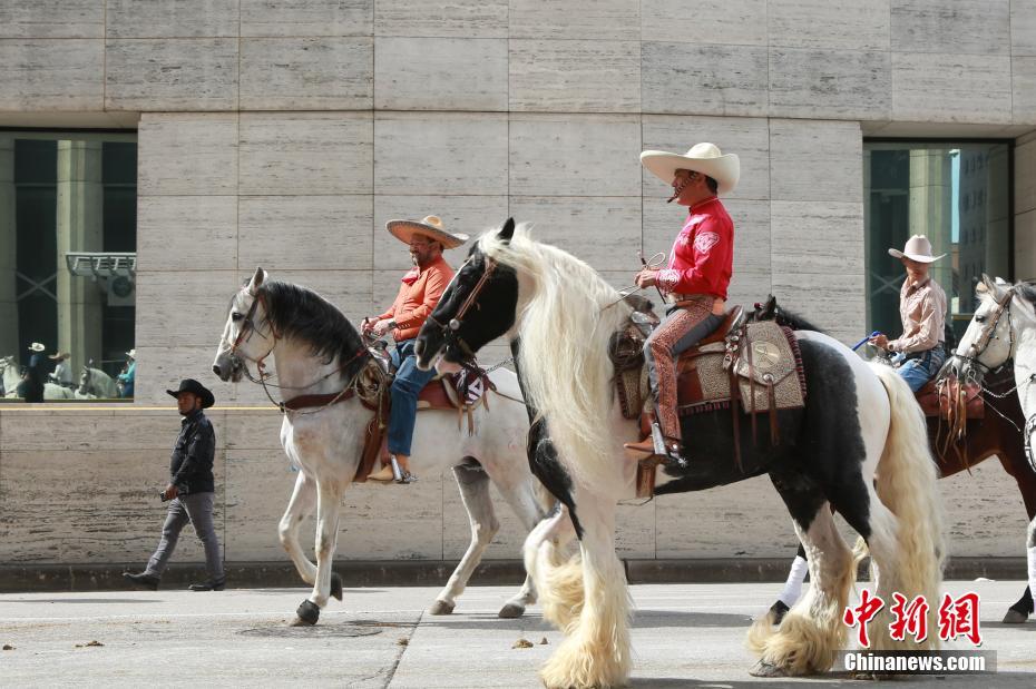 当地时间2月29日,美国休斯敦市中心举行2020年度牛仔节游行,百余辆花车和牛仔方阵在市民的欢呼声中沿街道行进,为一年一度的“休斯敦牲畜展与牛仔节”拉开帷幕。图为来自美国南部的西裔牛仔们参加游行。中新社记者 曾静宁 摄