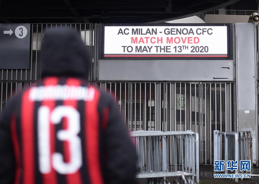 3月1日,在意大利米兰,一名AC米兰的支持者站在圣西罗球场外。标牌上显示AC米兰对热那亚的比赛推迟至5月13日进行。 截至当地时间3月1日下午6点,意大利的新冠肺炎累计确诊病例增至1694例。 新华社发 阿尔贝托·林格里亚 摄